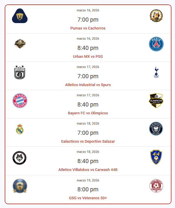 (2) 7:00 pmUnidad Deportiva Atletico Industrial vs Urban MX |